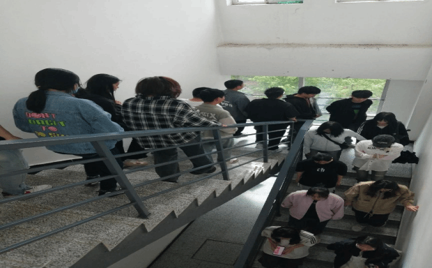 随后,消防警报响起,模拟图书馆发生火情,馆员与在馆学生迅速做出反应,在引导员的引导下,按照疏散路线捂住口鼻、弯腰俯身,快速、有序进行疏散。