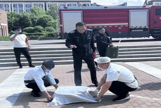 在实际操作环节,食堂工作人员分组使用灭火器扑灭模拟火源,消防员全程提供指导并纠正错误。在模拟油锅起火的场景中,工作人员利用灭火毯,按照“覆盖、隔绝空气”的步骤迅速扑灭了火情。