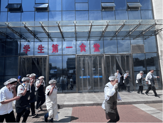 警报响起,食堂工作人员迅速断电关气,按预定路线引导人员疏散。食堂负责人清点人数后向演练总指挥汇报。